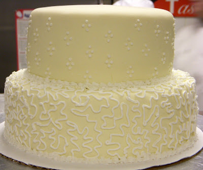 Today was our final where we were to make a two tiered wedding cake coated in buttercream then fondant with a shell border, fine piping, fondant or piped flowers, and a 10" square base with 6" round top, both 3.5" tall.